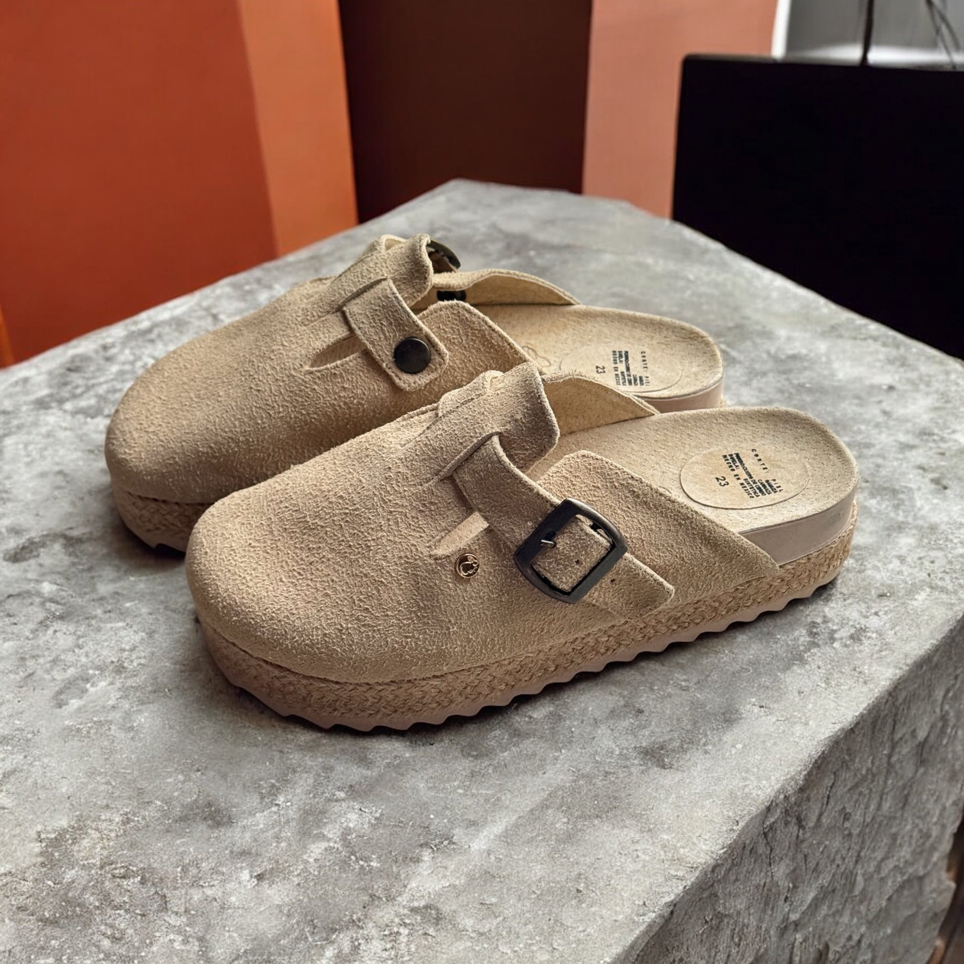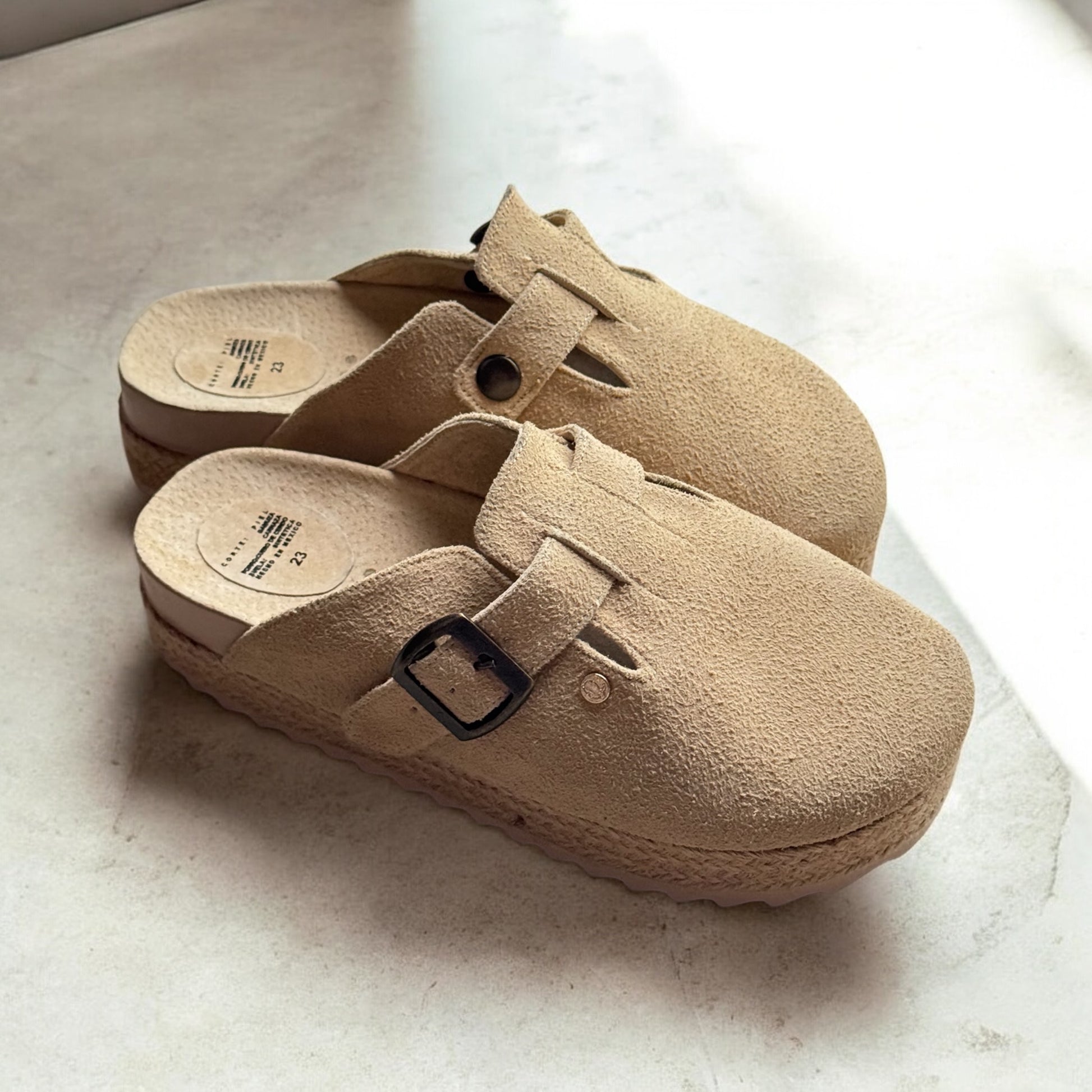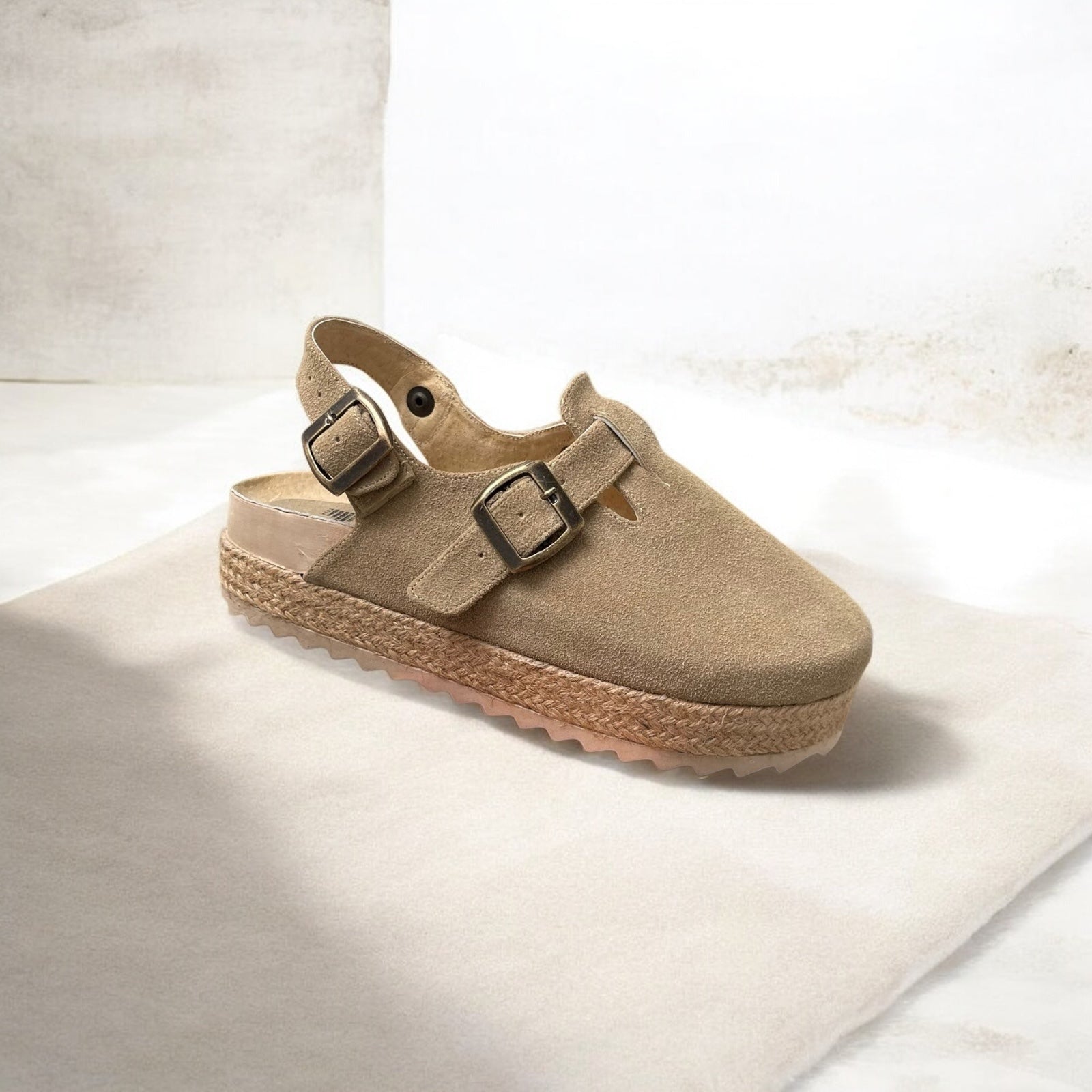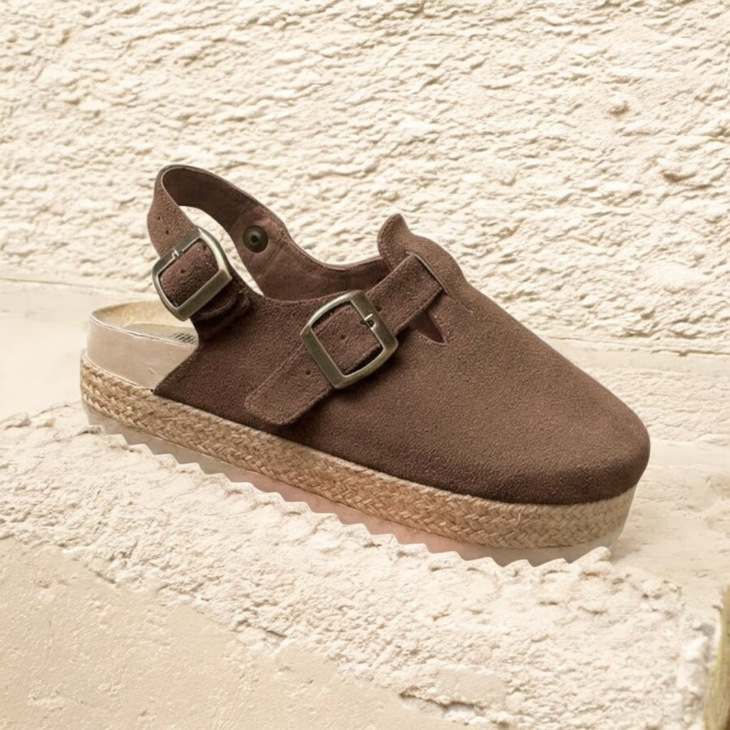 We designed these BONNIS Plats to achieve a fresh, original, and casual touch. These plats are 4.5 cm high and feature a beautiful jute design on the platform. They have an adjustable buckle for extra space and comfort, as well as a wraparound design that prevents bumps and chafing on the foot.